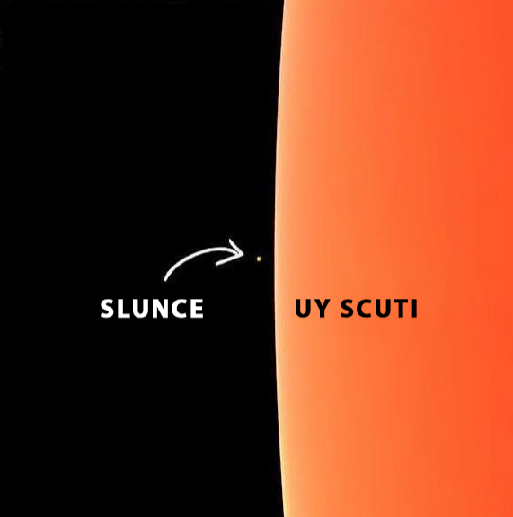 UY Scuti je největší doposud známou hvězdou. Nachází se přibližně 9500 světelných let od nás v souhvězdí Štítu. Pro představu je její poloměr 1,188 miliardy kilometrů, tedy 1708 poloměrů Slunce. Kdybychom ji tak postavili do středu naší soustavy, pak by její fotosféra dosahovala téměř z oběžné dráze Saturnu. Merkur, Venuše, Země, Mars i Jupiter by tak byly hvězdou pohlceny.