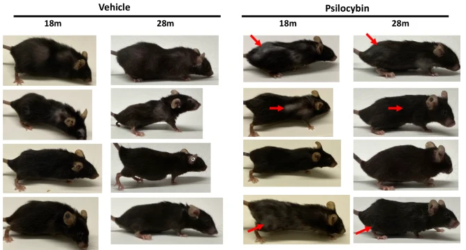 Největší překvapení však přinesl dlouhodobý pokus na myších. Zvířata ve věku odpovídajícím lidskému seniorskému věku dostávala 15 mg/kg psilocybinu po dobu deseti měsíců. Vzhledem k rozdílnému metabolismu myší a člověka je tato dávka ekvivalentem 25 mg/kg u člověka, což je dávka běžně používána v jiných studiích pro léčbu chronické bolesti. Přičemž bezpečná dávka u myší se pohybuje v hodnotách kolem 180 - 250 mg/kg. Na konci experimentu přežívalo 80 % ošetřených myší, zatímco ve skupině bez léčby pouze 50 %. Navíc se u ošetřených zvířat objevily i viditelné známky omlazení – zhnědnutí srsti, zarůstání lysin a zvýšená fyzická aktivita.