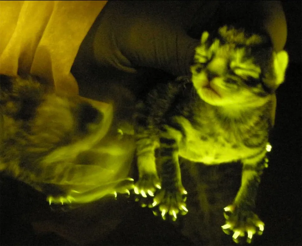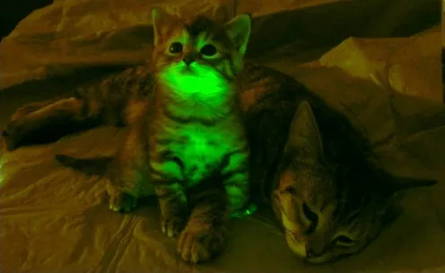 Zde je jedna z koček, která byla geneticky upravena tak, aby nesla geny kódující fluorescenční protein z medúzy, který způsobuje zelené zabarvení, a zároveň gen pro antivirový restrikční faktor pocházející z makaka rhesus. (zdroj Mayo Clinic)